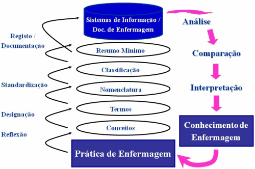 A figura abaixo ilustra bem a dinâmica circular da produção de conhecimento em Enfermagem. Os Sistemas de Informação e Documentação em Enfermagem são o elo de ligação da  Prática para o Conhecimento de Enfermagem.