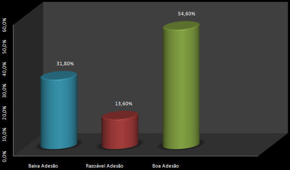 Pelo gráfico seguinte verifica-se que o maior percentual recai na “Boa adesão” com 54,6 por cento, de considerar ainda o valor percentual da “baixa adesão” com 31,8 por cento.
