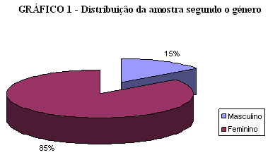A amostra foi constituída por 40 alunos do 1º ano de licenciatura em Enfermagem, com idades compreendidas entre os 18 e os 34 anos, sendo que a média de idades é de 21 anos; a grande maioria (85%) dos sujeitos de estudo é do género feminino, enquanto 15% são do género masculino (ver gráfico 1). Relativamente à nacionalidade, 92,5% é de nacionalidade portuguesa, enquanto 7,5% possui outra nacionalidade. No que concerne aos de locais de origem, 57,5% dos sujeitos de estudo são originários do distrito de Faro, 15% do distrito de Beja, 7,5% da região autónoma da Madeira, enquanto 2,5% é originária de outros distritos.