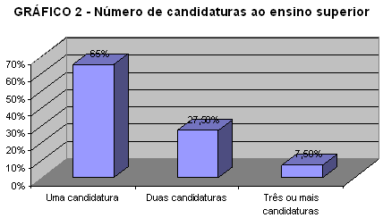 Verificou-se ainda que 65% dos sujeitos do estudo candidatou-se somente uma vez ao ensino superior, 27,5% candidatou-se duas vezes e apenas 7,5% efectuou três ou mais candidaturas as ensino superior, conforme se pode observar no gráfico 2. Em relação à frequência de outros cursos superiores, 70% refere nunca se ter inscrito ou frequentado anteriormente outro curso do ensino superior, enquanto que 30% dos sujeitos de estudo referiram já ter frequentado anteriormente outros cursos superiores. Somente 17,5% dos sujeitos de estudo admite poder vir candidatar-se a outro curso, enquanto que a grande maioria (82,5%) não admite poder vir a candidatar-se a outro curso superior.