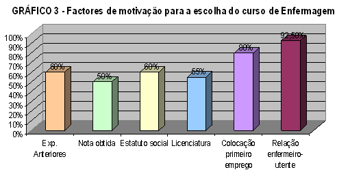 A possibilidade de obtenção do primeiro emprego, o estatuto social do enfermeiro, assim como as características laborais da profissão são factores de motivação importantes para o ingresso no curso de enfermagem, sendo a relação que se desenvolve entre enfermeiro e utente é igualmente determinante na motivação dos alunos.