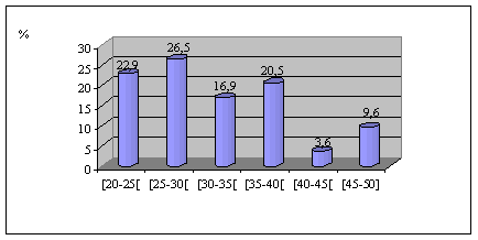 Através da observação do gráfico 2, verifica-se que a classe etária mais frequente (classe modal) é o intervalo [25-30 anos[,  com 26,5%. A média de idades é 31,17 anos. O mínimo é 22 anos, o máximo 49 anos, sendo a moda 24 anos.