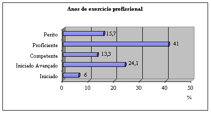 O gráfico 3 permite constatar que a variável anos de exercício profissional apresenta a moda em proficiente, com uma percentagem de 41%.