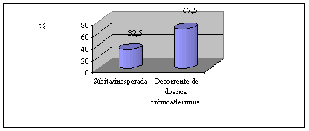 Através da análise do gráfico 4, observa-se que o tipo de morte com que os enfermeiros mais se confrontaram no último ano foi a morte decorrente de doença crónica/terminal com 67,5% do total, contra 32,5% que responderam confronto mais frequente com morte súbita / inesperada.