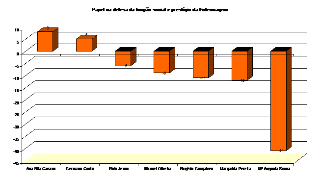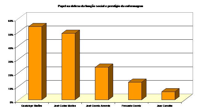 Os participantes manifestaram a sua opinião acerca do papel de diversos “actores internos” à profissão na defesa da função social, dignidade e prestígio da profissão de enfermagem. É de referir que a maioria dos presidentes da OE, assim como alguns sindicalistas, apresentam níveis elevados de desconhecimento da sua actividade pelos participantes. Os resultados, expressos seguidamente por ordem decrescente, entre OE e Sindicatos, exprimem as referidas opiniões.