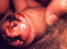 ![]() | Posteriormente, a lesão pode originar uma erosão do prepúcio, acompanhado de odor fétido e corrimento, podendo também estar associada a hemorragia. O envolvimento uretral ou vesical é raro, mas sem tratamento, a morte pode ocorrer nos 2-3 anos seguintes. Entre as manifestações deste tipo de carcinoma, encontram-se a astenia, a fadiga, o mal-estar e a perda de peso. São também relatadas queixas de prurido e ardor a nível do prepúcio e de corrimento fétido ocasional. As lesões benignas do pénis não são raras, no entanto, mediante a existência de metástases a nível femoral e ilíaco local, o prognóstico tende a ser significativamente mais reservado, havendo uma taxa de sobrevivência de cerca de 5 anos1. |