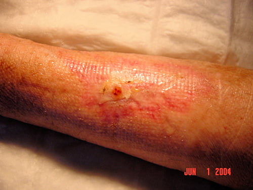 Segundo informação do próprio, aquando do diagnóstico da úlcera venosa, o tratamento inicial foi a aplicação de pensos hidrocolóides. Como não apresentava melhorias, foi efectuada uma nova avaliação médica e submetida a um tratamento por radiação com laser. Terá havido um retrocesso no processo cicatricial, segundo a doente.