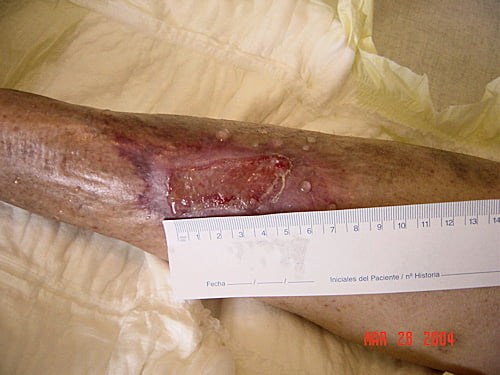 Da observação da ferida a 28 de Março de 2004 (Fig. 1), verificou-se que a área mais distal da perna se encontrava numa fase de granulação, os bordos superior e antero-lateral externos numa fase inflamatória, com presença de exsudado moderado e os bordos externos à úlcera apresentavam uma demarcada área de tecido rosado que corresponde à área radiada com laser (nesta área a pele encontrava-se muito fragilizada). A pessoa não apresentava o membro inferior edemaciado, contudo apresentava dor ao toque e a ferida não tinha odor. No primeiro dia a ferida foi medida, tendo 5,5 cm de comprimento (Fig. 2) e 3 cm de largura (Fig.3). É importante medir e fotografar periodicamente a ferida, com o objectivo de se fazer uma correcta avaliação da evolução da ferida e da eficácia do tratamento.