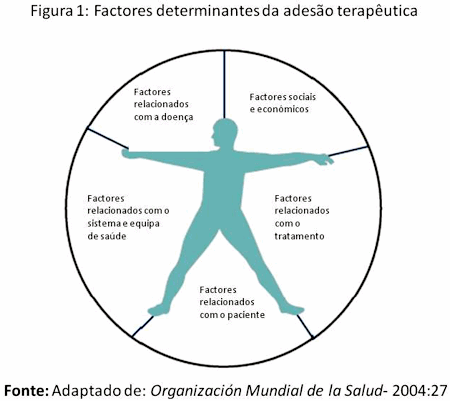 São descritos vários factores nos diagnósticos da NANDA como promotores da não adesão: os sistemas de valores do cidadão, sejam as crenças de Saúde, influências culturais ou os valores espirituais, bem como as relações cidadão/prestador de cuidados, o medo ou ansiedade. Outros factores que podem interferir na adesão são factores financeiros, aspectos relacionados com o tratamento nomeadamente a duração e complexidade do tratamento ou por alteração nos hábitos de vida diária. Para uma melhor compreensão apresentamos de uma forma esquemática os factores determinantes da adesão (Figura 1).