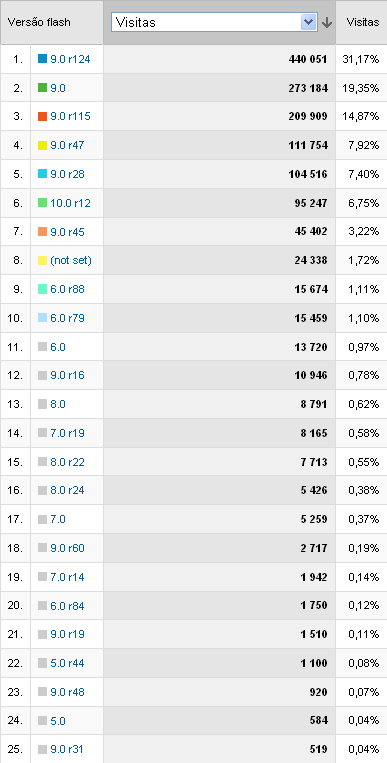 De todos os visitantes, apresentamos as 25 versões Flash mais utilizadas pelos Navegadores de Internet (foram detectadas 91):