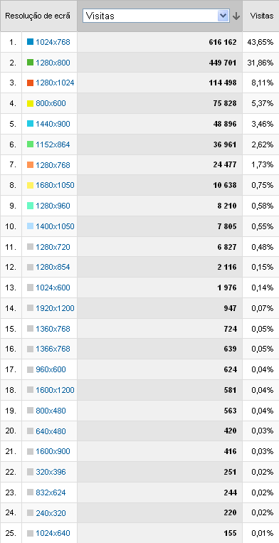 Resoluções de ecrã mais utilizadas, num total de 200: