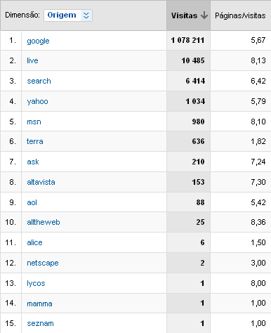 Foram localizadas 15 origens dos visitantes que chegaram ao site através de Motores de Pesquisa: