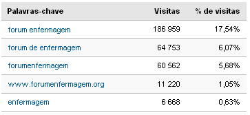Palavras-chave principais utilizadas nos motores de pesquisa que levaram os visitantes ao Forumenfermagem num total de 310.876 :