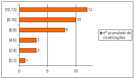 Relativamente ao curso evolutivo do processo cicatricial, verificou-se que, no período pré-estabelecido de 12 semanas, todas as úlceras apresentaram uma evolução cicatricial positiva, tendo-se verificado uma taxa de cicatrização de92,30%, visto apenas 1 úlcera, das 13 em estudo, não ter cicatrizado (embora apresentasse uma evolução cicatricial muito positiva) (Quadro nº 8). Também foi possível verificar que, em todos os casos onde foi possível avaliar o diâmetro, a evolução foi extremamente positiva, com o diâmetro da úlcera a diminuir a cada tempo de avaliação (Quadro nº 9).