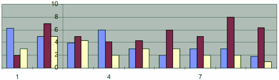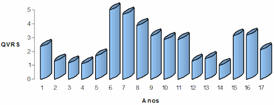 A comparação das pontuações resultantes do Sickness Impact Profile revelou que houve uma diminuição nas pontuações totais do PSIP ao longo dos primeiros anos de Hemodiálise, sendo a diferença estatisticamente significativa (p<0,001) (Quadro 1.9). Na realidade, a pontuação no primeiro ano é de 2,4 %, diminuindo nos quatro anos seguintes para valores na ordem da unidade, estes resultados foram confirmados pela regressão múltipla constituindo o primeiro cluster.