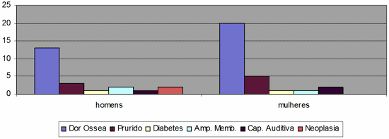 A avaliação da influência do grau de perturbação dos sintomas associados a comorbilidades revelou a existência de uma associação estatisticamente significativa entre a qualidade de vida no geral e o grau de perturbação dos sintomas. Com efeito, ao analisarmos a influência de comorbilidades (Quadro 1.11) verificámos que a dor óssea e o prurido foram as mais apontadas como responsáveis pela baixa qualidade de vida relacionada com a saúde, com pontuações globais de 13,1% e 17% (p<0,001 e r =0,351) nos homens e mulheres, respectivamente. Verificámos também a existência de situações clínicas de diminuição da acuidade auditiva, em ambos os géneros, que apresentou valores de significância na qualidade de vida. Refere-se que estes casos têm-se manifestado recentemente não sendo muito conhecida a sua etiologia.