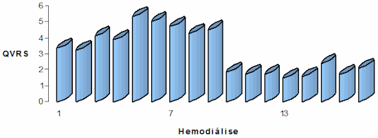 Quanto à pontuação global obtida em cada uma das categorias independentes relativamente à hemodiálise, as disfunções referidas que mais afectam a qualidade de vida foram o regime hídrico com valormax de 11,3%, o regime dietético com 9,8%, o sono e repouso com 5,8%. Estas disfunções com diferenças estatisticamente significativas perduram durante todo o período de tratamento de hemodiálise sendo determinantes pela diminuição de qualidade de vida relacionada com a saúde.