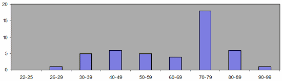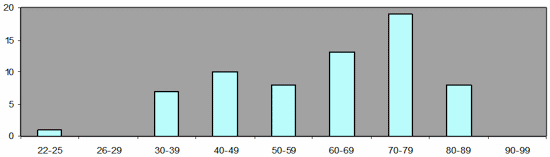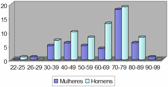 Em termos comparativos, o comportamento da nossa amostra em estudo apresenta diferenças na faixa etária no que diz respeito ao género. Pela análise do Quadro 1.4 verificamos que a população masculina distribui-se mais homogeneamente pelas diferentes idades, notando-se um nítido crescendo a partir dos 30 anos que, apesar de apresentar o elemento mais novo da Clínica NephroCare de Braga, não deixa de ser uma população envelhecida. A população feminina manifestamente apresenta uma concentração na classe 70-79.