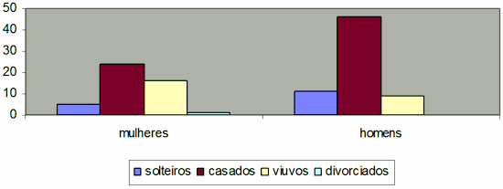 Quanto ao estado civil mais de metade da amostra estudada é casada correspondendo a 62,50% (24 mulheres e 46 homens), a população solteira apresenta o valor de 14,29% com 5 mulheres e 11 homens, e cerca de 10% dos indivíduos não tem parceiro (16 mulheres e 9 homens por viuvez) e uma mulher por divórcio correspondendo 0,89% do universo total (Quadro 1.5).