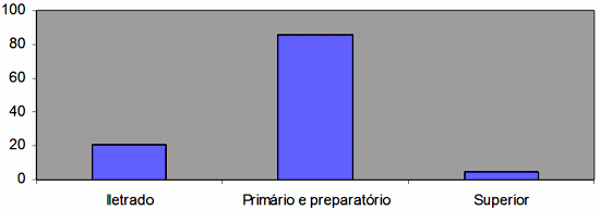 No que diz respeito à distribuição quanto ao grau de escolaridade, a maior parcela da amostra, com 86 indivíduos, corresponde ao ensino primário e preparatório. Apenas três inquiridos concluíram uma licenciatura, existindo dois a frequentar um curso superior. Quanto à iliteracia o universo apresenta-se significativo, com cerca de 20% (Quadro1.6).