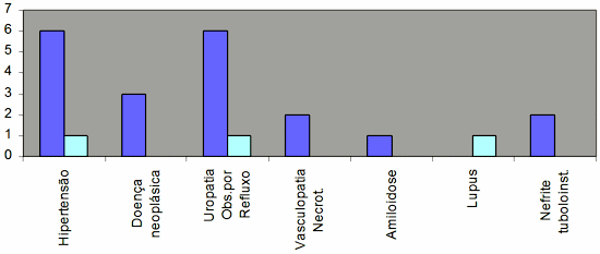 Na etiologia da Insuficiência Renal Crónica Terminal observou-se que 23,21% dos casos são de origem desconhecida, existindo diversas patologias que acarretaram a entrada em hemodiálise como a doença poliquística do rim (10,71%), a hipertensão arterial (14,29%) e a diabetes mellitus (14, 29%). A causa, clinicamente, identificada como uma das principais foi o Síndrome Nefrótico Crónico com 31,25% (Quadro 1.7a). Quanto à influência da etiologia segundo o género verificou-se, de uma forma mais premente, que a doença neoplásica, a vasculopatia necrotisante, a amiloidose (P.A.F.) e a nefrite tubolointesticial foram exclusivas ao género masculino (Quadro 1.7b). A doença lúpus foi a única causa responsável restrita ao género feminino para a entrada em hemodiálise. O carácter de hereditariedade inerente a estas patologias não se encontra na transmissão autossomática, pelo que o seu surgimento é independente do género.