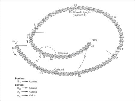 A insulina, proteína pequena com um peso molecular de aproximadamente 5.800 daltons, é sintetizada pelas células beta dos ilhéus de Langerhans do pâncreas. Estruturalmente, é composta por duas Cadeias – A (com 21 aminoácidos) e B (com 30 aminoácidos) – ligadas entre si por pontes dissulfureto.