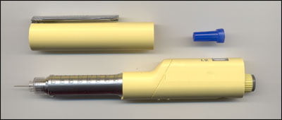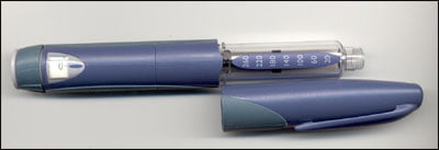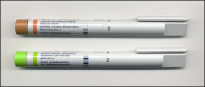 Durante os anos 80 foram introduzidos no mercado, dispositivos denominados vulgarmente por canetas (vulgo pen), compostas por um local destinado à inserção da recarga (ou cartucho) contendo a insulina, um botão doseador, que permite dosear o n.º de unidades a administrar e por um visor que possibilita a visualização desse mesmo n.º de unidades.