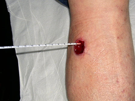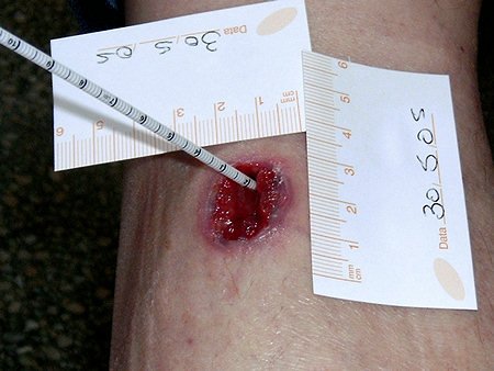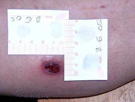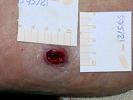 O Sr. J. I., é um paciente com 40 anos, vitima de uma ferida no membro inferior esquerdo, por uma causa traumática, levando ao aparecimento de uma ferida incisiva com comunicação óssea, apresentando-se como uma loca. Após 30 dias de tratamento ambulatório com iodopovidona pomada + compressa seca, numa frequência de realização de pensos a cada 3 vezes por semana, verificou-se que não tinha existido qualquer evolução cicatricial, apresentando um leito sangrante, mas sem sinais de progressão a nível de profundidade e de aproximação dos bordos da ferida (Foto 1). Ao dia 30 (18/5/05) do tratamento standard, a ferida apresentava dimensões de 1,5 cm de comprimento e 1,3 cm de largura (área total- 1,3 cm2), com uma profundidade de 3 cm., tendo iniciado aplicação de um penso de espuma de poliuretano, mudando os pensos a cada 4 dias.