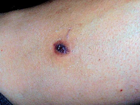 A 8/6/05, verifica-se uma ausência de profundidade, com dimensões de 1,1 cm de comprimento e 0,7 cm de largura (área total- 0,6 cm2)* (Foto 4). Nesta data, para além da inexistência de profundidade e qualquer contacto com outras estruturas, verifica-se a contracção dos bordos da ferida, indicando uma cicatrização total, sem existência de encerramento “em falso”. A partir desta data passou a realizar o penso 1 x por semana. Apresentou cicatrização total na data de 16/6/05 (Foto 5), com encerramento completo da ferida, existindo apenas uma coloração mais enegrecida da zona afectada. Deste caso, podemos retirar que em 30 dias (15 pensos), não foi obtido qualquer sucesso com a medida instituída (iodopovidona pomada + compressa seca), sendo que em apenas 25 dias (7 pensos) foi obtida a cicatrização total. Foi realizado follow-up após 30 dias, sem existência de recidiva. A análise de custos é feita mais adiante nesta artigo.