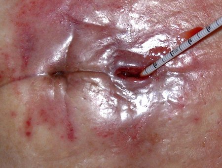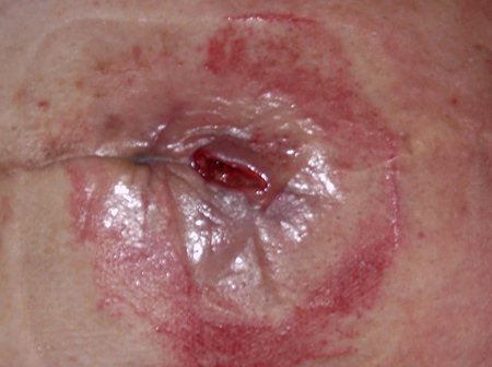 A Sr.ª J. é uma paciente de 69 anos, sujeita a cirurgia abdominal (Foto 6), da qual resultou deiscência da sutura operatória com um sinus tractus de 5,5 cm de profundidade*. Apresentava duas feridas comunicantes entre si, com eliminação de conteúdo seropurulento em grande quantidade. Apresentava 1,3 cm de comprimento e 0,5 cm de largura*. Tinha indicação terapêutica para realização de penso diário com iodopovidona pomada, o que em face à utente viver longe do Centro de Saúde (12 km) levava a que os custos fossem incomportáveis para a utente. Foi tomada a decisão terapêutica, com a anuência da paciente, de realizar o penso com um penso de espuma de poliuterano para cavidades, em virtude do mesmo se ter indicação para utilização em deiscências pós-operatórias. No dia 12/8/05 (Foto 7), foi iniciada a colocação do penso de poliuretano para cavidades, associado a um penso de poliuretano sem adesivo, com mudança do penso a cada 3 dias.