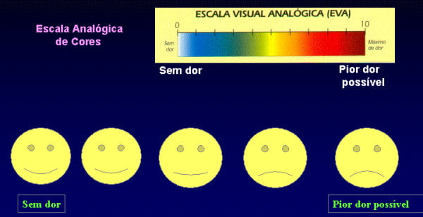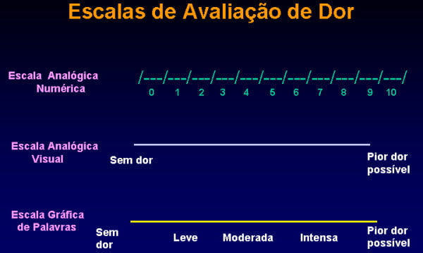 As escalas qualitativas ou quantitativas, nas quais se pede ao paciente para indicar um valor para a sua dor em números (de 1 a 5 ou de 1 a 10) Escala Numérica de Dor ou a Escala de Descritores Verbais, onde se pede ao paciente referir a intensidade (sem dor, leve dor, dor moderada, dor intensa e dor insuportável) e por desenhos onde indica uma graduação de faces, de sorridentes a chorosas, a Escala de Faces.1, 6 e 7