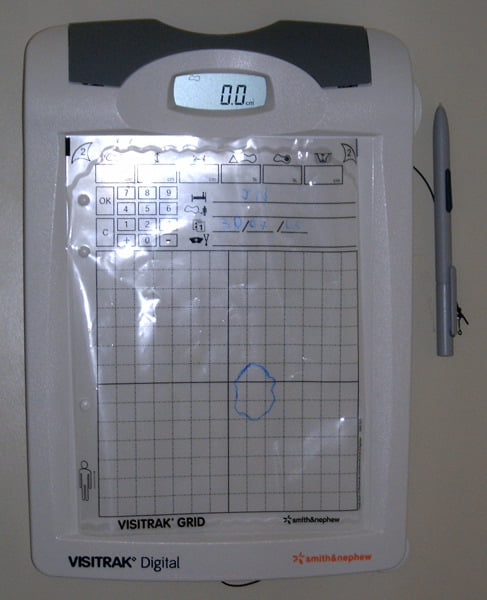 Assim, a planimetria digital portátil é um método ainda relativamente recente, que engloba um aparelho digital com superfície plana, um estilete esterilizado e duas camadas de folha de acetato. As folhas de acetato são colocadas sobre a ferida e esta é decalcada para as mesmas. A folha que esteve em contacto com a ferida é eliminada e a folha onde foi realizado o decalque é colocada sobre o aparelho onde é novamente repetido o tracejado obtido originalmente. Através deste método, é possível obter, independentemente da forma geométrica da ferida, o maior comprimento, a maior largura, a área total da ferida, a alteração percentual da área da ferida a partir de avaliações anteriores e a percentagem de tecido não viável ou tecido viável, se estas foram também decalcadas (Moore, 2005). De facto, este método é bastante fácil de realizar e em estudos comparativos com outros métodos como sejam o comprimento X largura e o acetato, apresentou melhores taxas de fiabilidade inter-observador (Flanagan, 2003; Gethin, 2006).
