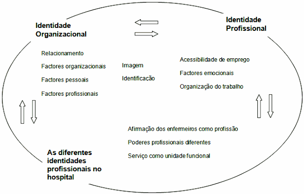 From the results one may observe that nurses image about their organization and profession, as well as their self identification with both, have an important role, either for their organizational identities or for their professional ones. On the other hand, the professional identity of a specific group acts upon the organizational identity of the hospital and vice versa, and both influence and are influenced by several identities co-existing in the hospital. The association of all these factors acts upon the permanence of nurses in the hospital.