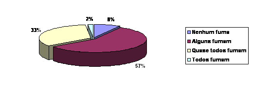 O motivo porque fumaram pela primeira vez, foi na grande maioria “por curiosidade” (87,23%).Verificou-se que 89,36% dos adolescentes fumam em média 1-10 cigarros por dia. A maioria fuma às escondidas dos pais (72,34%). Referindo que fumam mais quando estão com amigos.