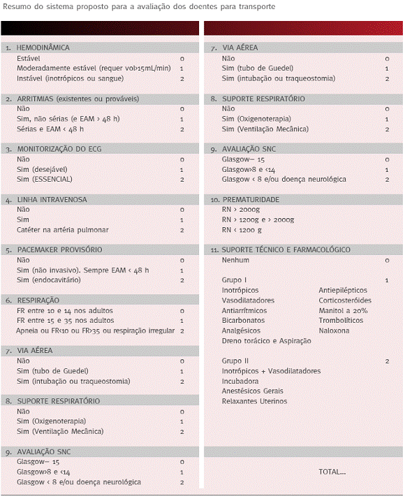 Desde a vulgar situação de doente que necessita de recorrer a uma observação por uma especialidade que não existe no primeiro local de socorro ou atendimento, e em que não está em causa o risco de vida mas sim um parecer técnico e início da terapêutica, até à situação mais complicada do doente crítico, propõe que a decisão deverá ser baseada em dados objectivos clínicos, permitindo ajuizar com maior rigor e mais sistematização a generalidade dessas decisões. Propõe, por parecer mais adequado aos interesses atrás explicitados, o score de risco de transporte (quadro 1), idealizado por Etxebarria e colegas, publicado no European Journal Emergence Medicine em 1998, e que permite através de parâmetros fisiológicos e terapêuticos decidir a necessidade de acompanhamento do doente por enfermeiro, por enfermeiro e médico e ou mesmo qual o tipo de transporte que deverá ser utilizado (quadro 2). Este score deverá estar preenchido, salvaguardando de igual modo a decisão tomada em relação ao acompanhamento do doente, que é da responsabilidade do médico.